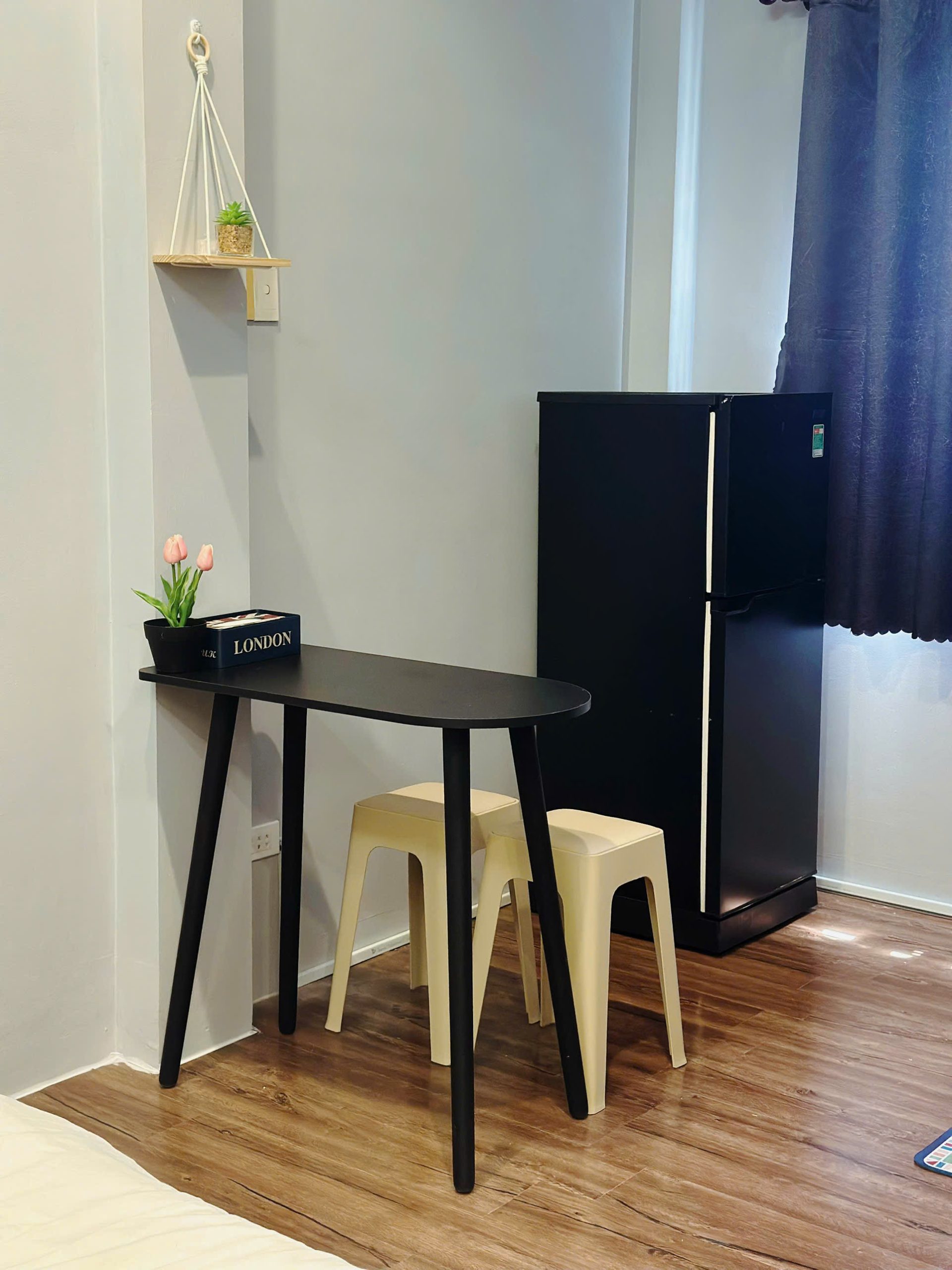 Góc cửa sổ nhỏ với rèm tối màu cho phép bạn tách mình khỏi thế giới bên ngoài, thu mình trong ánh sáng dịu và hơi thở riêng của căn phòng. Một chiếc ghế đơn đặt cạnh giá sách nhỏ nơi bạn có thể nhâm nhi tách cà phê, nghe vài bản jazz nhẹ, hay viết một lá thư tay chưa từng gửi.